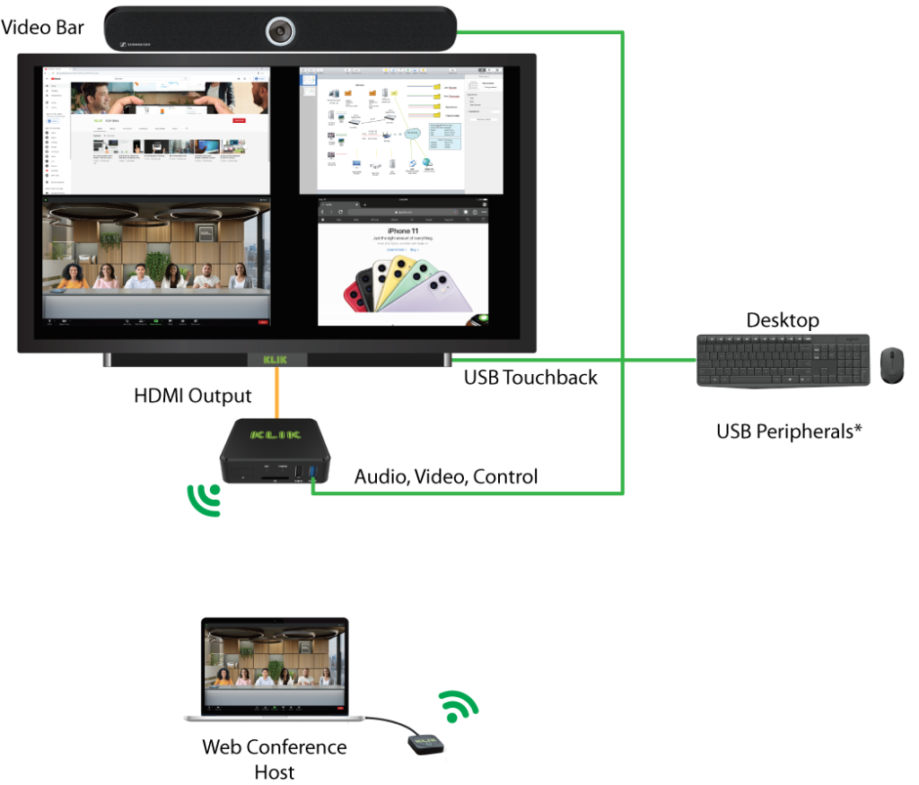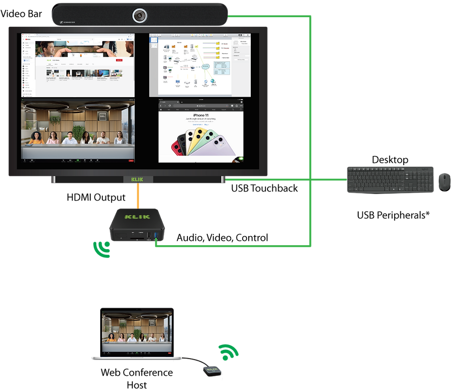 KLIKLink adds wireless screen sharing, video conferencing, and touch control to any USB-C* or HDMI PC.