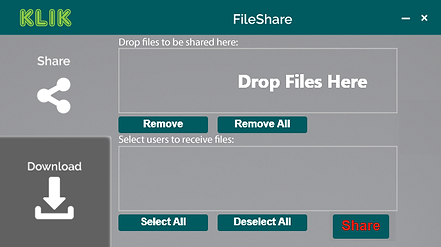 KLIK includes an intuitive File Sharing feature that makes it easy to distribute digital assets to students. Just drag and drop any file into the file-sharing window and select from one to all recipients and press Share. The files are immediately available to your students, without requiring downloads from servers or cloud accounts.