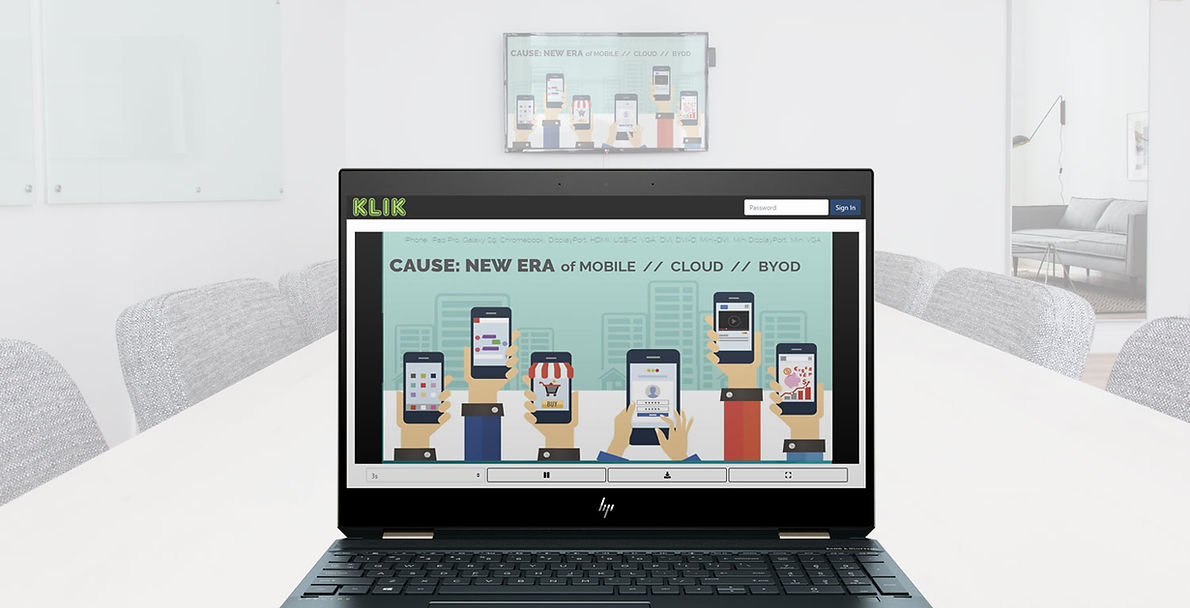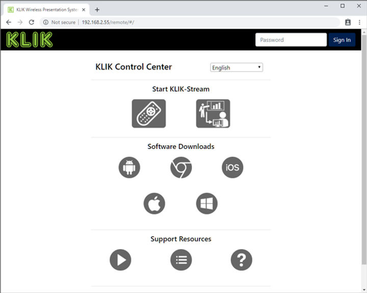 KLIK Control Center is your direct access point to KLIK software apps, support options and the Media Player. It also allows users to view the presentation on their own device, with KLIKStream.