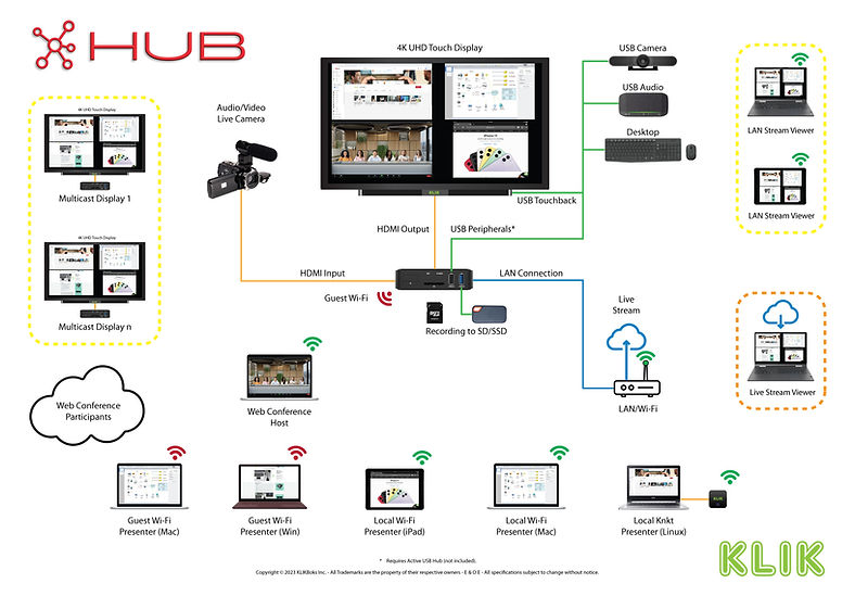Connect the KLIK to a display (4) and the included power supply (6). If available, connect to a network using an Ethernet cable (2). HUB will power on and display its standby screen.